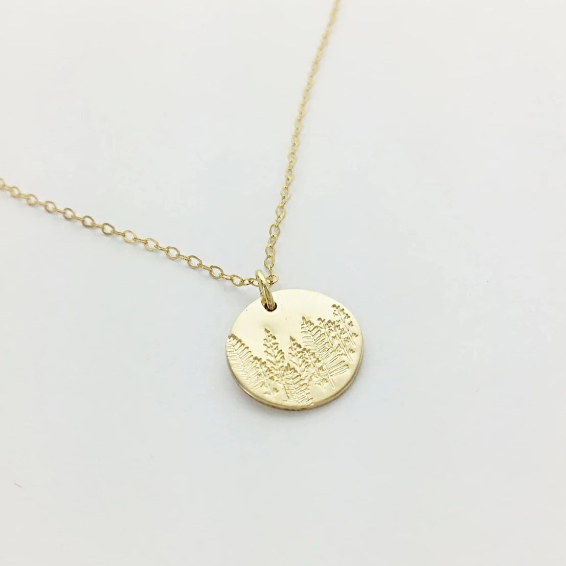 We love this unique forest necklace! We engrave a variety of trees on a gold filled, sterling silver, or rose gold filled disk.